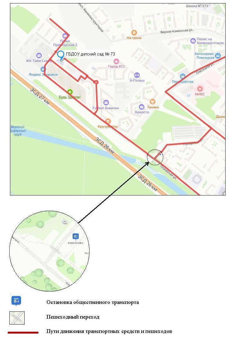| Ближайшие остановки общественного транспорта:"Глухарская улица"Пешеходные переходы нерегулируемые.Весь путь проходит по выделенному пешеходному пути с асфальтовым покрытием.Расстояние до входа на территорию ГБДОУ 930 метров.Время движения пешком 11-13 минут."Плесецкая улица"Пешеходный переход нерегулируемый.Весь путь проходит по выделенному пешеходному пути с асфальтовым покрытием.Расстояние до входа на территорию ГБДОУ 960 метров.Время движения пешком 11-13 минут."Проспект Авиаконструкторов, угол Глухарской улицы"Пешеходные переходы нерегулируемые.Весь путь проходит по выделенному пешеходному пути с асфальтовым покрытием.Расстояние до входа на территорию ГБДОУ 1300 метров.Время движения пешком 15-17 минут.